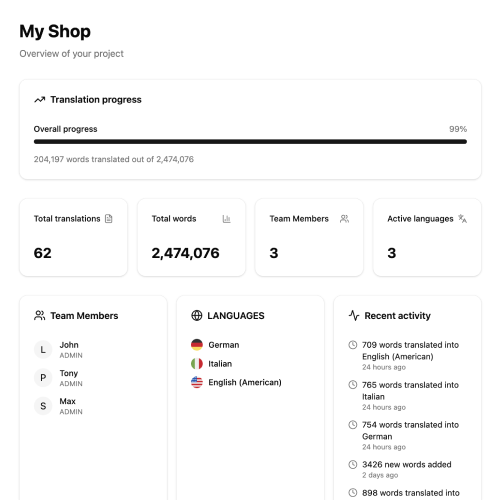 Accelerate your project through simplified management and fluid translation automation. If needed, correct in bulk with your team.